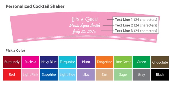 Make your own baby shower favors with our personalized cocktail shakers. Each shaker is 2.5" x 6" and can be filled with your own treats, including nuts, candies, popcorn and anything else you can think of.