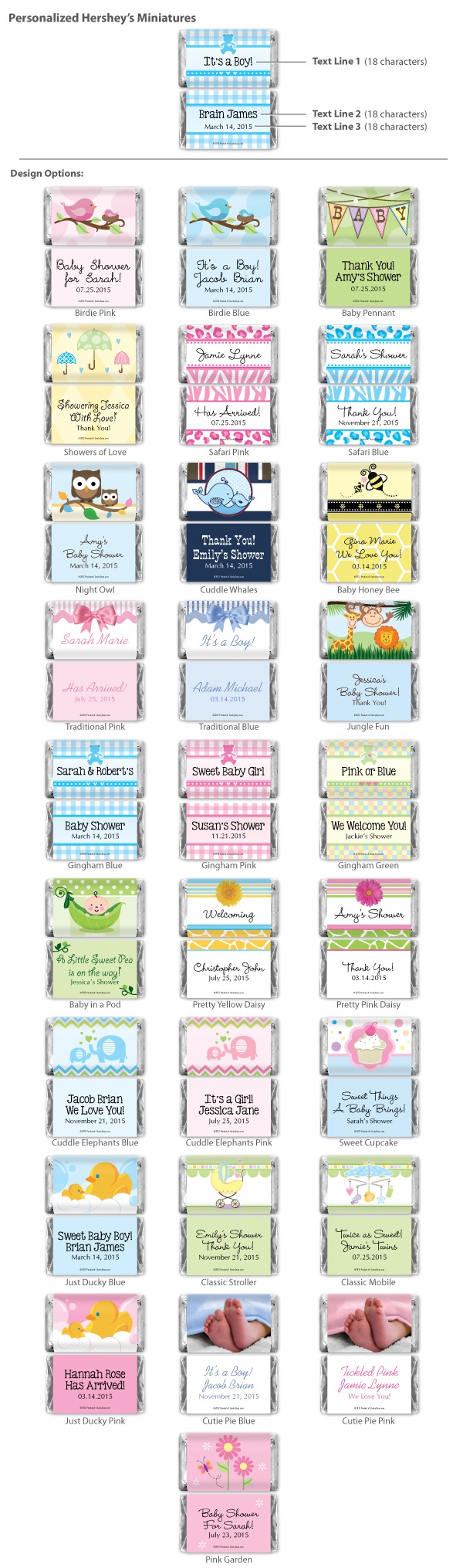 These Hershey mini bars are the perfect treat for your next baby shower. Each comes with your design choice and personalized text.